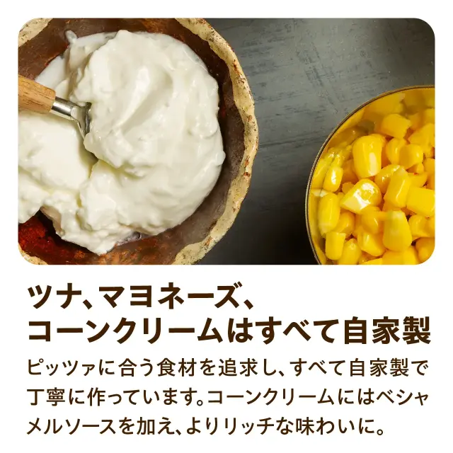ピッツァに合う食材を追求し、すべて自家製で丁寧に作っています。 コーンクリームにはベシャメルソースを加え、よりリッチな味わいに。