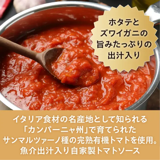 北海道産ホタテとズワイガニ、トマトソースに使用するワタリガニなど、魚介を贅沢に盛り込みました。産地が明確で、防腐剤、発色剤、酸化防止剤を使用していません。