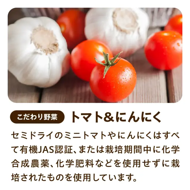フレッシュトマトはすべて有機JAS認証、 または栽培期間中に化学合成農薬、 化学肥料などを使用せずに栽培されたものを使用しています。