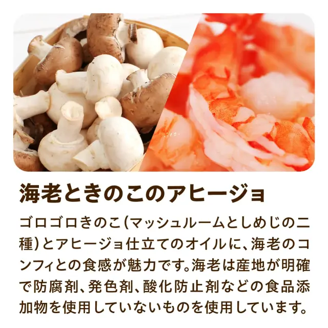 - 小麦粉(国内製造)、ぶなしめじ、マッシュルーム、えび、植物油、ミニトマト、にんにく、塩、白ワインビネガー、砂糖、酵母、白ワイン、(一部にえび・小麦を含む)