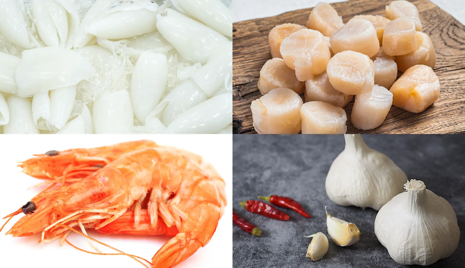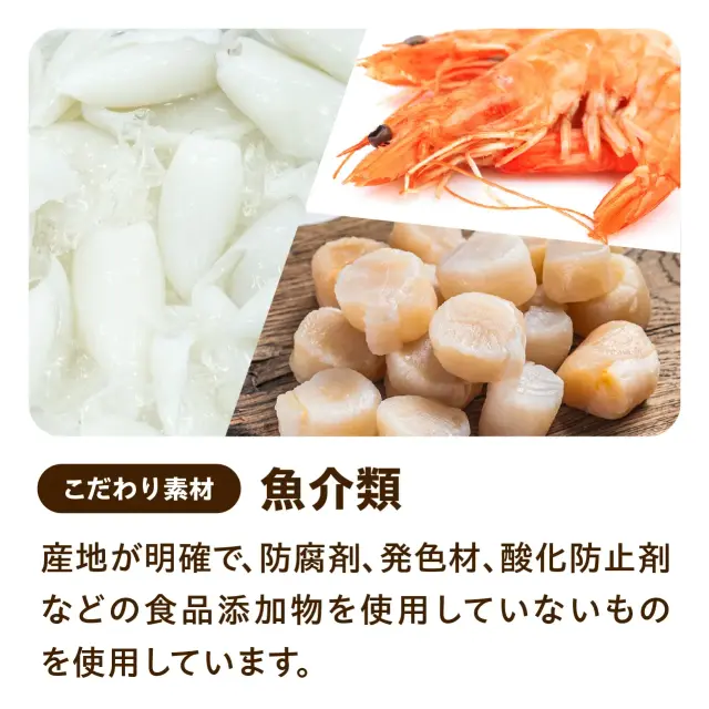 - 小麦粉(国内製造)、トマトソース、いか、えび、ほたてがい、植物油、たまねぎ、牛乳製モッツァレラチーズ、白ワイン、にんにく、塩、砂糖、アンチョビ、酵母、とうがらし、オレガノ、(一部にえび・小麦・乳成分・いかを含む)