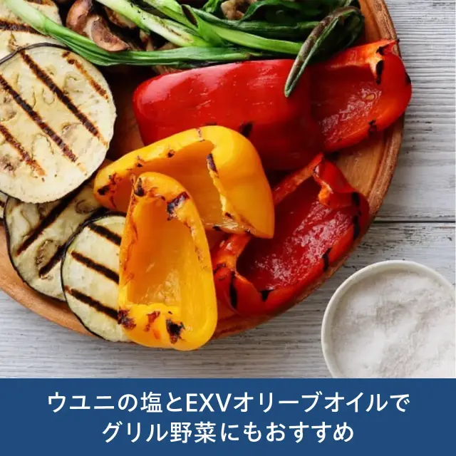 素材の味を引き立たせ、魚介類の塩焼き、グリル野菜、