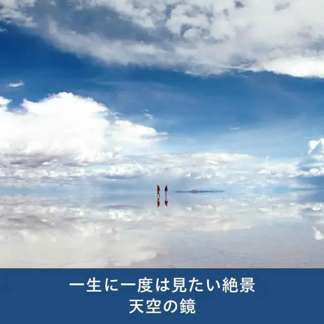 塩水が張った湖面が空を映し出す様は「天空の鏡」と言われ世界有数の絶景スポットです。